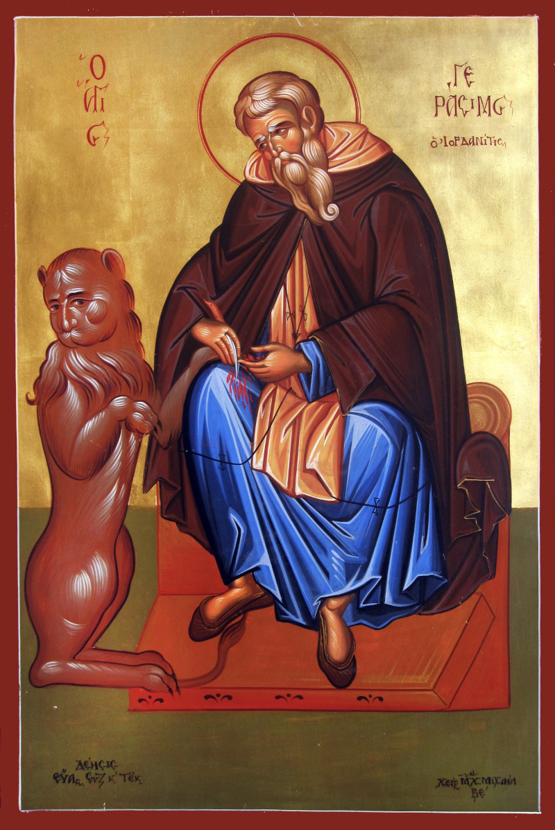 Одним із найпоширеніших переказів про святого є історія про його зустріч із пораненим левом. За легендою, Герасим не злякався звіра, а допоміг йому, вийнявши скалку з лапи. Після цього лев став ручним і настільки прив’язався до подвижника, що виконував монастирські доручення та охороняв віслюка обителі. Коли святий помер у 475 році, тварина, за переказами, теж загинула від туги на його могилі. Історія нагадує вірянам про духовний сенс любові та гармонію людини з Божим творінням.