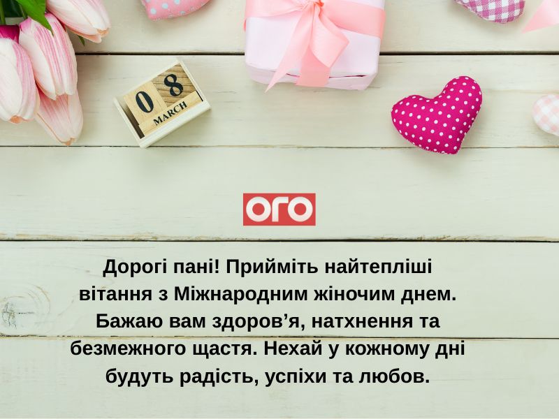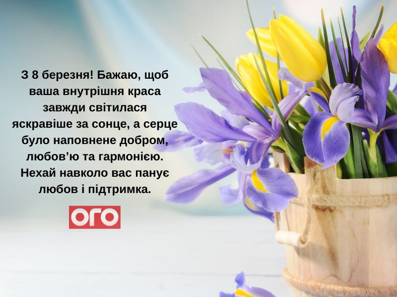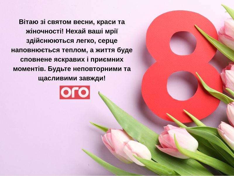 Вітаю з 8 Березня! Нехай у вашому житті завжди буде багато тепла, любові, радості та гарного настрою. Нехай кожен день дарує нові можливості, а поруч завжди будуть щирі та добрі люди.