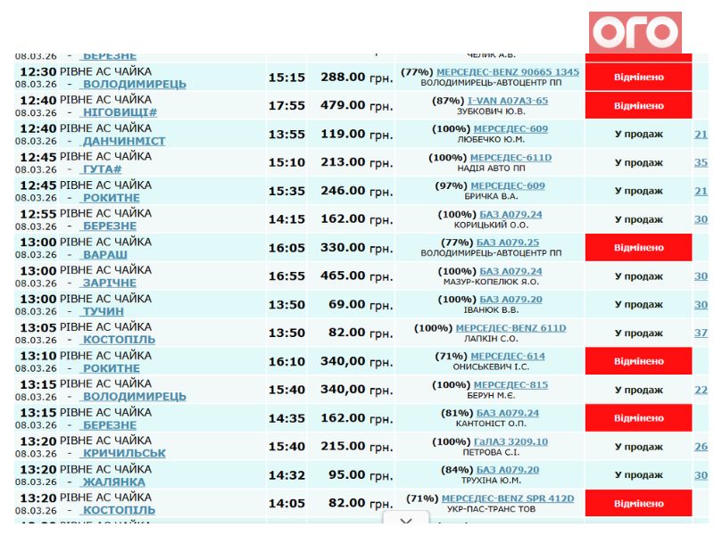 Згідно з розкладом, деякі маршрути мають статус «Відмінено». Водночас значна кількість рейсів усе ще виконується, а квитки на них перебувають у продажу.