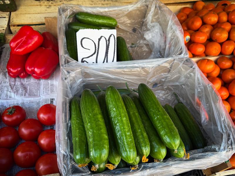 Якщо порівнювати з минулим роком, то стрибок вражає. Сьогодні гуртові ціни на огірки коливаються в межах 135-165 грн/кг, а на томати — від 120 до 140 грн/кг. Це приблизно на 25-30% дорожче, ніж у цей же період минулого року. У роздрібних мережах, з урахуванням націнок, ці цифри стають ще соліднішими. Так, нещодавно журналістка нашого видання пофотографувала ціни на овочі та фрукти на Центральному ринку Рівного. Ціни на фото: огірки до 200грн/кг, помідори до 180грн/кг.