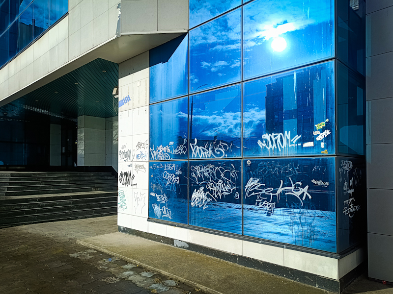 Скло — в графіті, фасад — чорніє, штукатурка сиплеться, а поруч — вічний супутник нашої естетики “економкласу” — черговий секонд-хенд. Контраст — у всій красі.