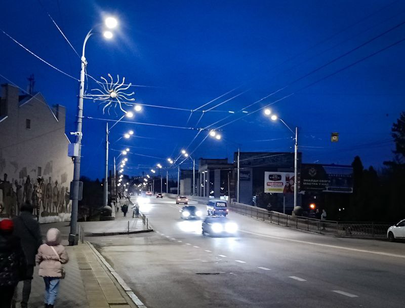Не відстає від цієї краси й головний міст Рівного на вулиці Соборній — у світлі автомобільних фар він переливається так само яскраво, доповнюючи атмосферу свята. Місто сяє, рухається та живе у своєму передріздвяному ритмі, нагадуючи всім: магія вже поруч.