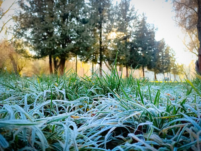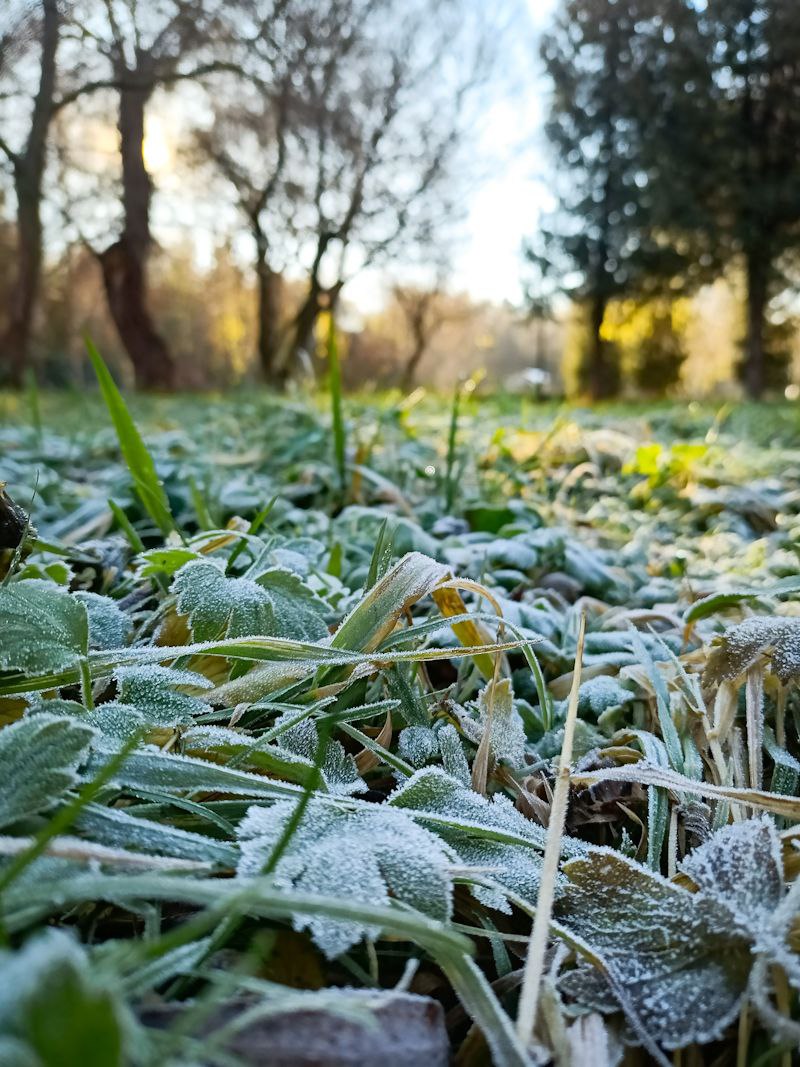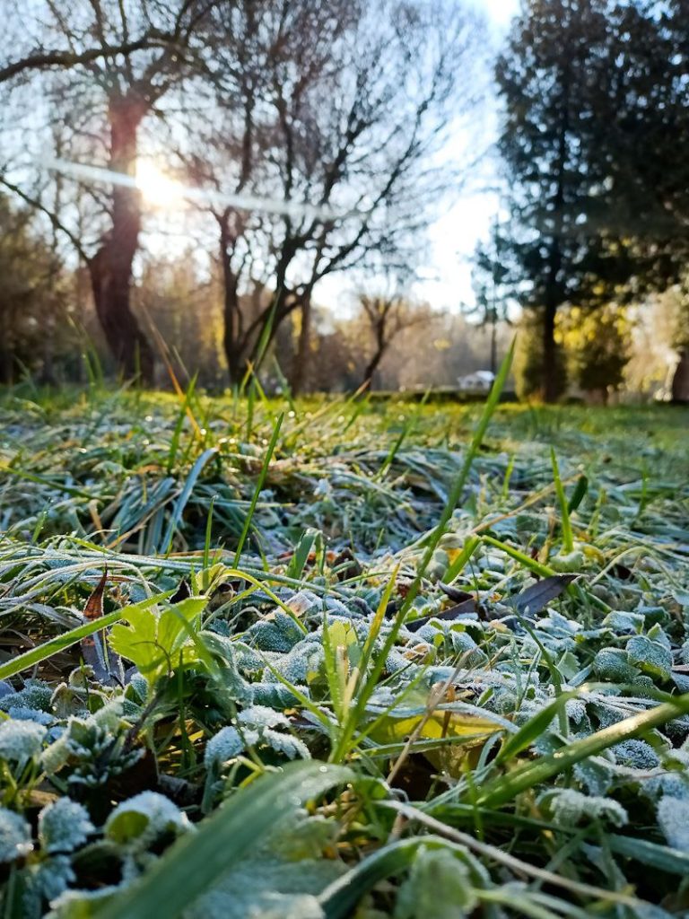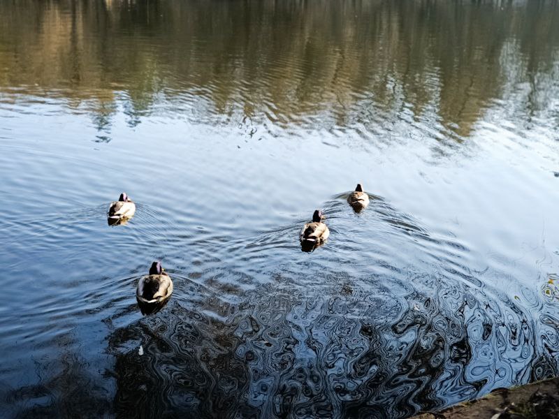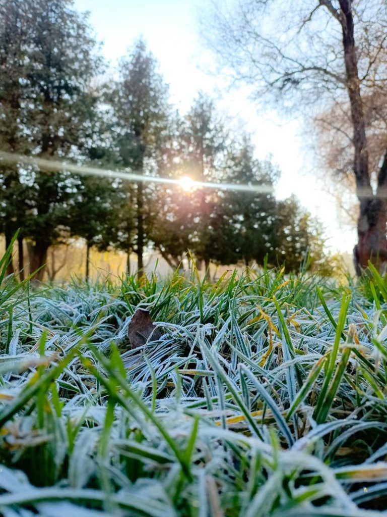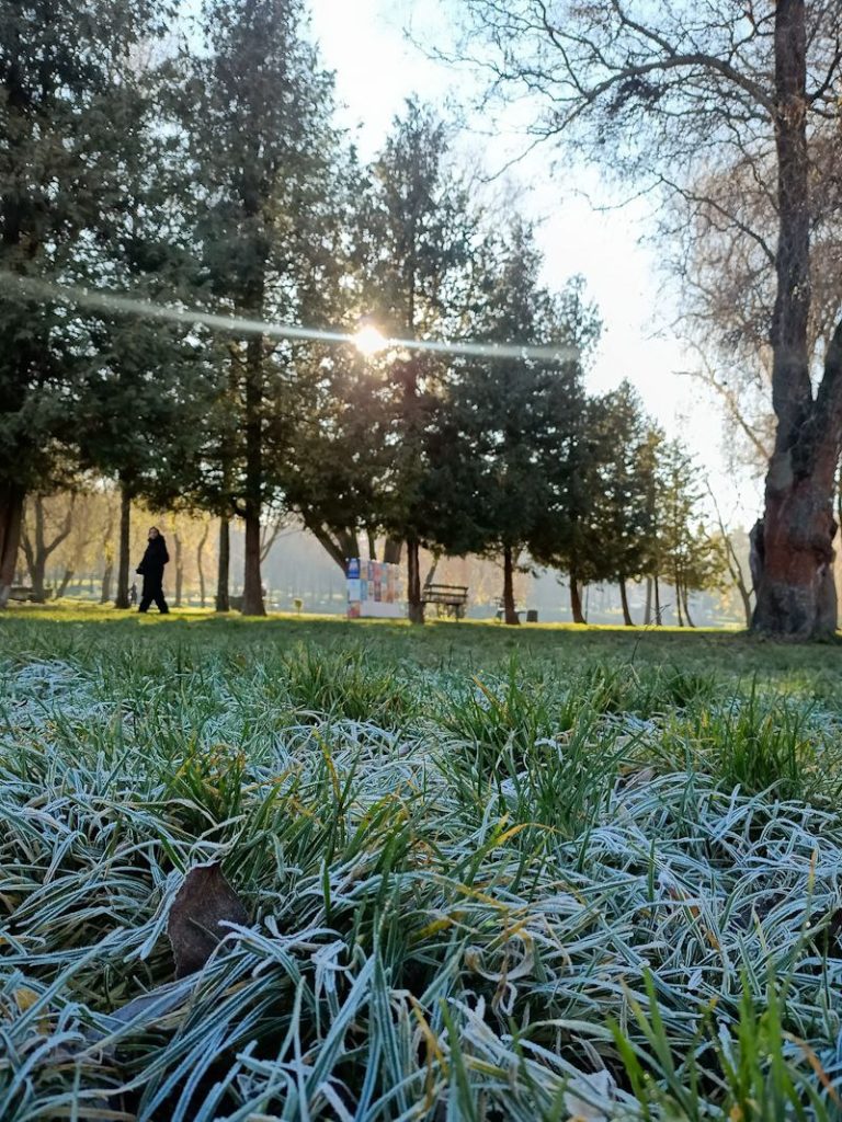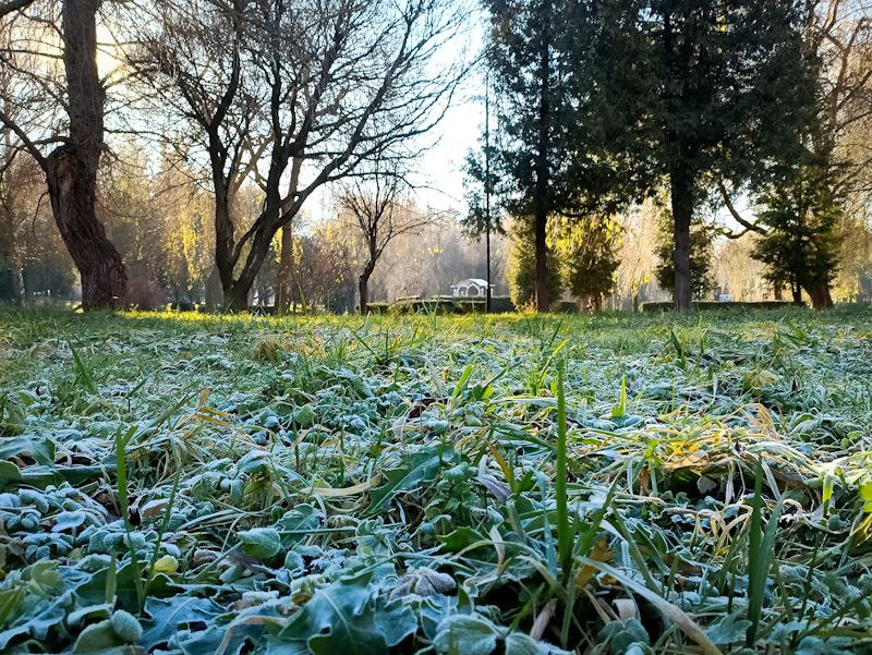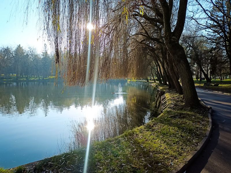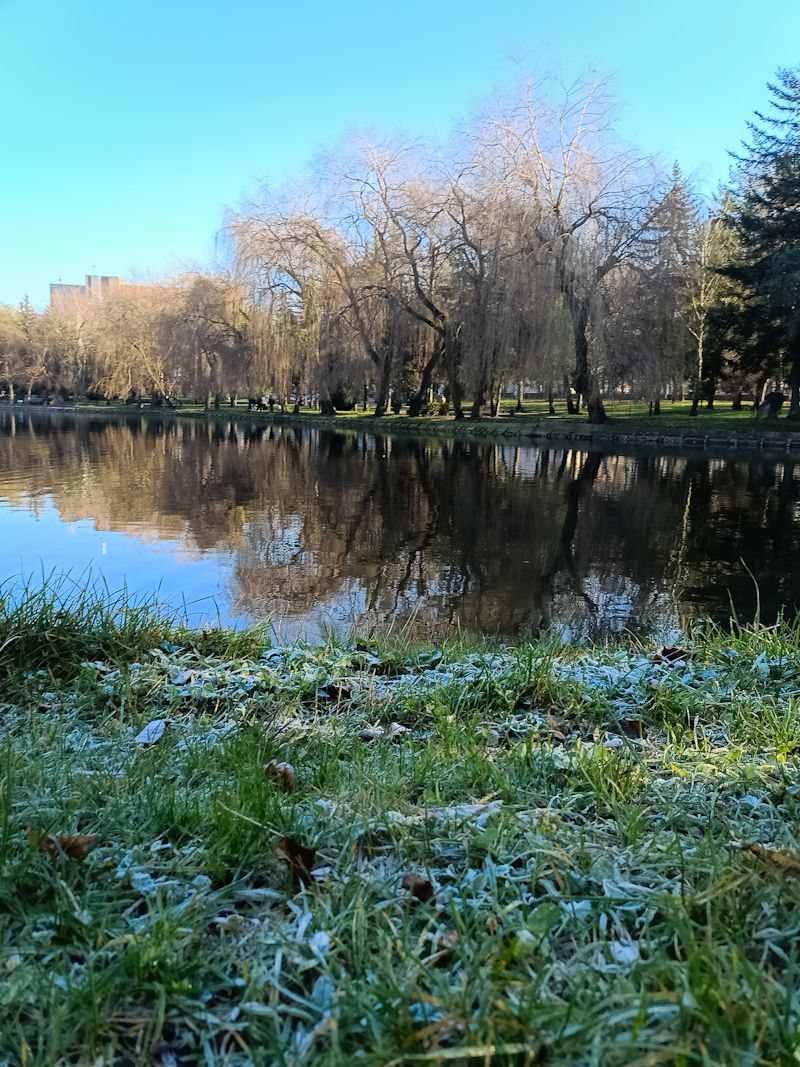 Сонячне проміння м’яко пробивається крізь гілля дерев, створюючи живу гру світла й тіней. На озері неспішно плавають птахи, ніби доповнюючи цю зимову картину рухом і життям. А в затінених куточках парку ще зберігся ранковий іній — там, де сонце ще не встигло торкнутися землі, він сріблом вкриває траву.