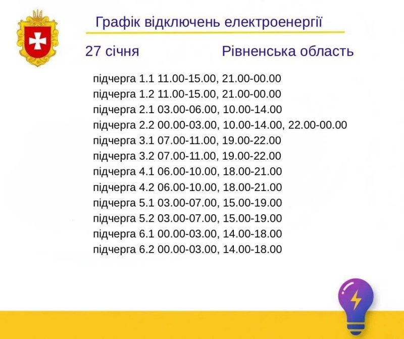 Графік відключень на 27 січня