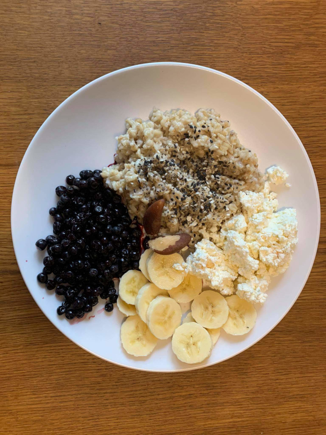 Крупу відварюють у воді або молоці — залежно від того, що більше полюбляє дитина. Можна використовувати цільну або плющену вівсянку, пшоно, кіноа чи інші види круп. У готову кашу додають масло та жменю ягід. Фрукт нарізають довільними шматочками та викладають поруч. Кисломолочний сир подають окремо або змішують із кашею — за потреби та апетитом дитини.