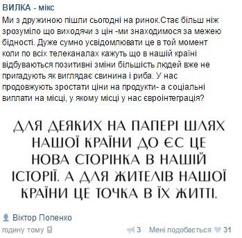 В піраміді людських потреб поїсти стоїть на першому місці. Нижче потреб немає, зате є вищі потреби – одягнутися, відпочити, купити книгу, сходити в театр. Так от до чого я… На якому ми місці у світі? Декілька прикладів: у Рівному почали закриватися продуктові магазини, ПРОДУКТОВІ МАГАЗИНИ, КАРЛ!!! Фірма “Івіта” минулого Великодня не встигала випікати і розвозити паски, а цього року – завал. Про що ще говорити? На такому дні ми не були ніколи за усю історію незалежності. Ну, але давайте послухаємо телеканали! Там ми живемо все краще і краще.