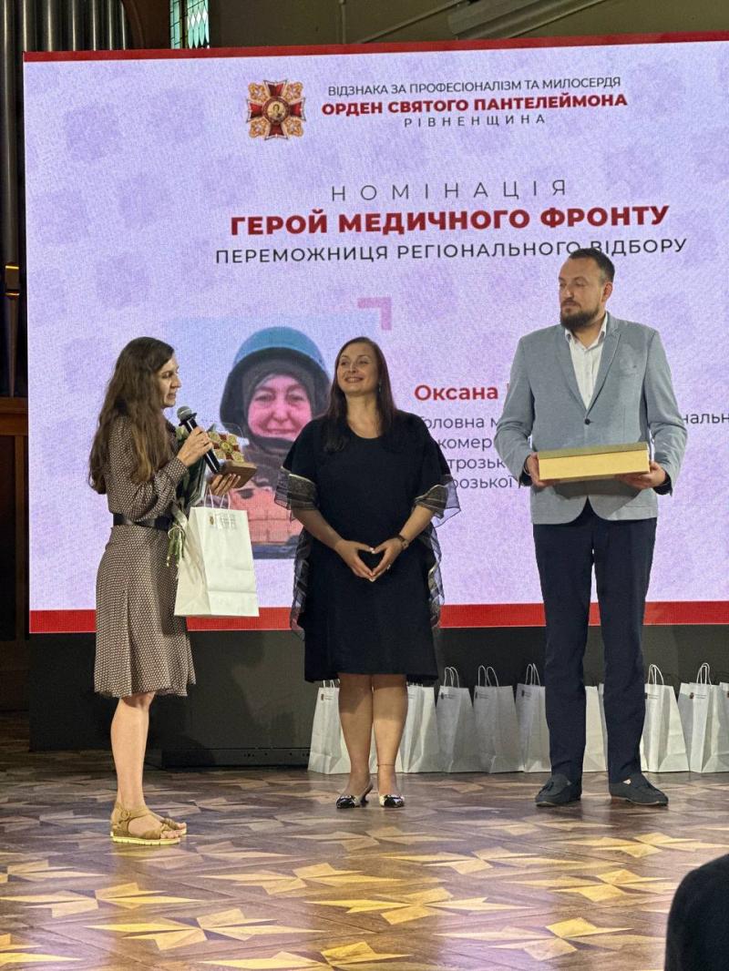 Нещодавно Оксана Іванівна отримала високу нагороду — Відзнаку за професіоналізм та милосердя «Орден Святого Пантелеймона» у номінації «За самовіддане служіння українському народу, мужність і стійкість у боротьбі за здоров’я українців, за свободу та незалежність України у війні з російським агресором». Це визнання — закономірний результат її багаторічної невтомної праці та незламної громадянської позиції. Сама вона не змогла отримати нагороду, бо знаходить на передовій. Цю почесну місію виконала її донька – Дануся.