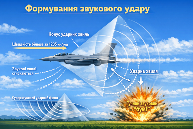 Якщо літак летить швидше за звук (понад ~343 м/с або ~1235 км/год у стандартних умовах), він наздоганяє власні звукові хвилі. Це створює зону високого тиску, яка раптово досягає землі — і ми чуємо її як вибух, або “бум”.