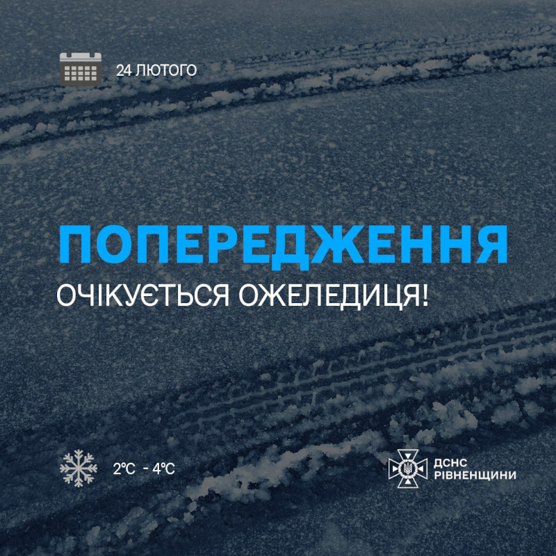 За даними Рівненського обласного центру з гідрометеорології, 24 лютого на автошляхах Рівненської області та в місті Рівному очікується збереження ожеледиці.