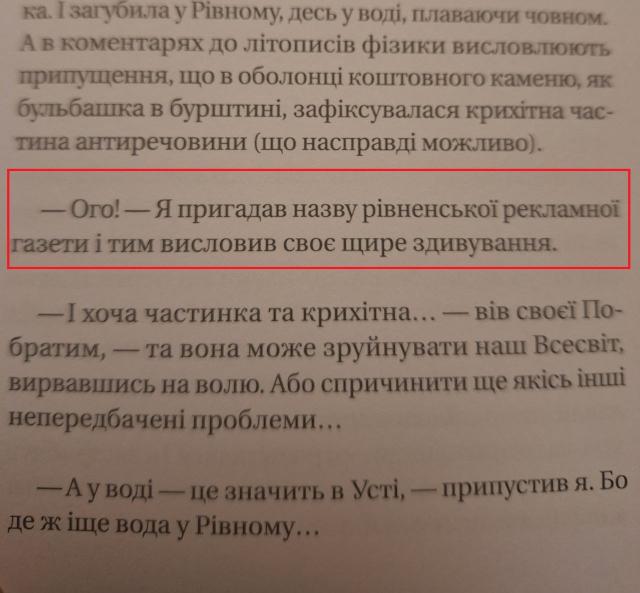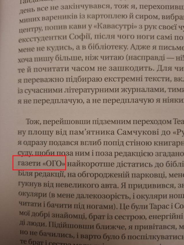 Те, що йдеться саме про Видавничий дім «ОГО», автор підтверджує на наступній, уже 9 сторінці, коли ліричний герой, прямуючи до Рівненської обласної універсальної бібліотеки, проходить повз будівлю, де розташоване «ОГО».