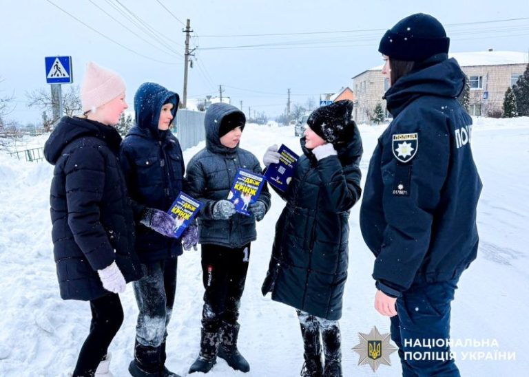 Офіцери нагадують дітям про правила дорожнього руху в умовах ожеледиці. Школярі дізнаються про необхідність носити світловідбивальні елементи в темну пору доби.