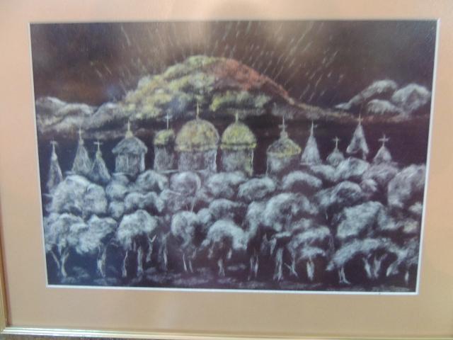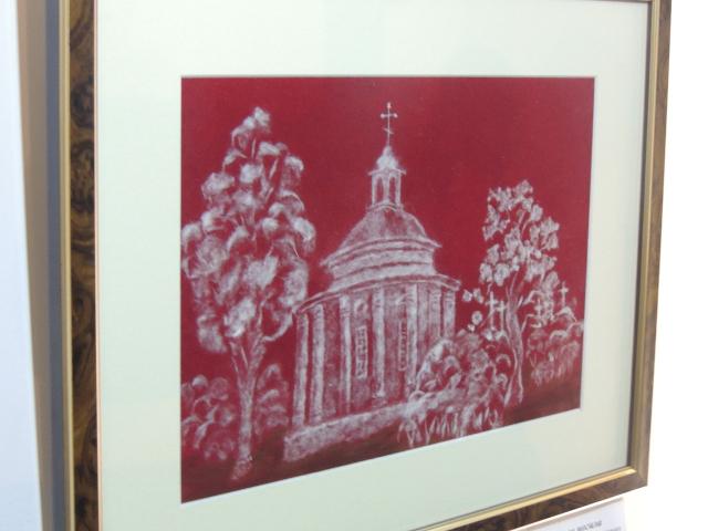 — Залежно від того, який відтінок мені потрібно зробити, беру певну кількість пуху. Вже знаю, скільки саме треба, відчуваю руками, це вже практика, досвід, — ділиться пані Ольга. Окидає оком експозицію і додає. — Писати храми дуже складно, адже немає попереднього малюнка, а треба дотриматися стилю, архітектурного, культурного…