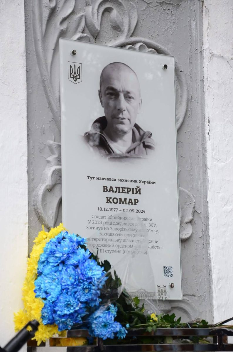 Валерій Комар навчався у цій школі, працював на рівненських підприємствах і пішов на фронт у травні 2023 року — за 16 місяців до загибелі. Про відкриття меморіальної дошки повідомила Рівненська міська рада.